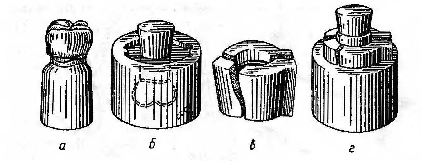 о — металлический штамп; б — штамп погружен в кювету с легкоплавким металлом; е — металлическая контрформа; г — установка штампа с гильзой перед штамповкой.