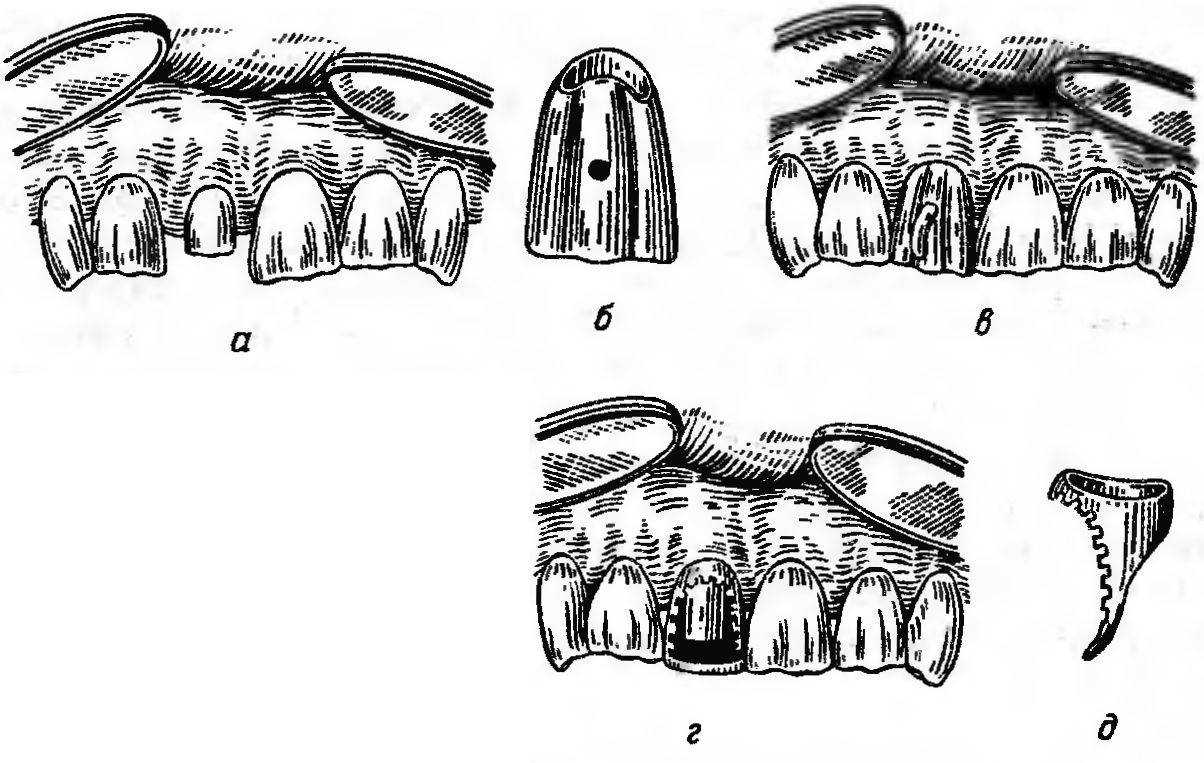 а — препарированный зуб; 6 — металлическая коронка; в — коронка, наполненная воском, фиксирована на культе зуба; г — короика с вырезанной вестибулярной поверхностью на модели; д — вид коронки сбоку.