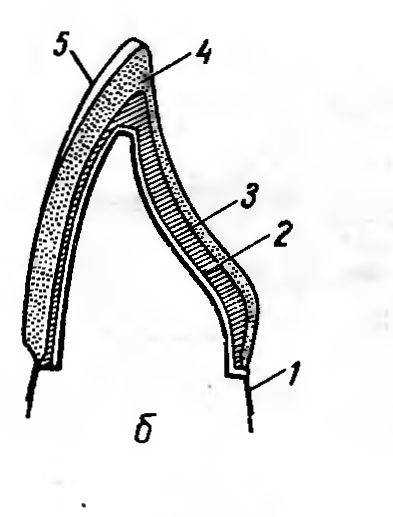 / — фольга. 2 — базисный слой; S — дентин-масса; 4 — эмаль: 5 — стекломасса.