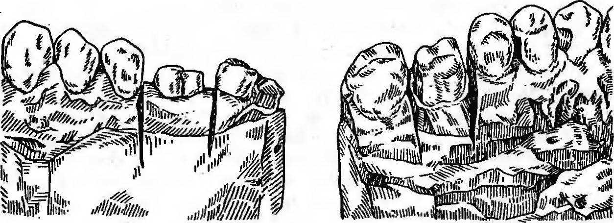 Изготовление разъемной модели. Применяют методику, описанную в разделе «Модели». Чтобы получить высокопрочную разъемную модель для изготовления керамической коронки, несколько иначе подготавливают основание модели зуба. Распиливают рабочую часть разъемной модели, извлекают культю протезируемого зуба и обрабатывают участок основания культи от уступа в направлении к штифту на протяжении 1,5—2,0 мм слегка на конус. Сужение на конус направлено к уступу (рис. 107), что должно обеспечить свободное снятие платиновой матрицы с модели зуба. Остальная часть имеет параллельные стенки или суживается в сторону штифта. Обработку основания модели зуба проводят цилиндрической металлической фрезой при небольших оборотах бормашины.