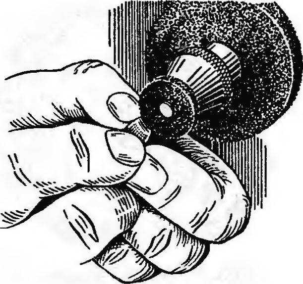 Рнс. 136. Положение зуба и пальцев рук техника в момент шлифовки.