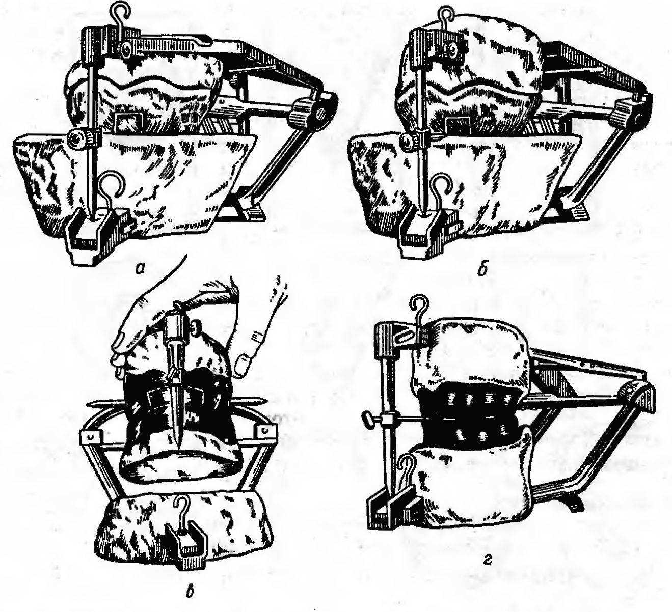 Рис. 188. Установка моделей в среднеанатомический артикулятор при помощи прибора Васильева.