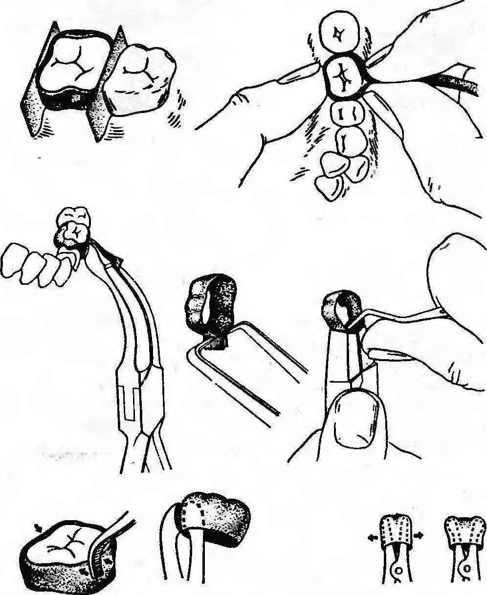 гипса, удаляют прокладки, расположенные между зубами, и готовят кольца из бандажной ленты. Для этого полоску бандажной ленты длиной в 4—5 см изгибают в виде петли, накладывают на коронку соответствующего зуба и обтягивают крампонными щипцами или плоскогубцами. После этого излишки ленты отрезают, оставив 2 мм около шва, концы пригибают к оральной поверхности кольца и контактной электросваркой припаивают в нескольких местах или спаивают концы, шлифуют, отбеливают и полируют (рис. 216). Следует стремиться и у таких колец создать окклюзионные опорные площадки, не позволяющие провести кольцо в десневой карман, чтобы не травмировать зубные связки.