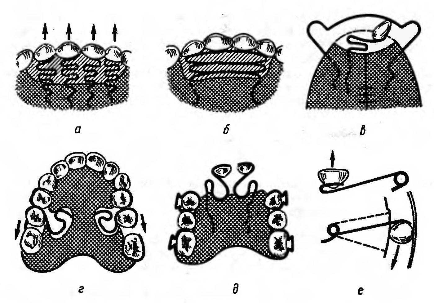а — змеевидные; в овальные; е, г, д — ругообраэные (по Д. А. Калвелису); е — рычагообразные. Стрелками показано направление силы действия пружин.