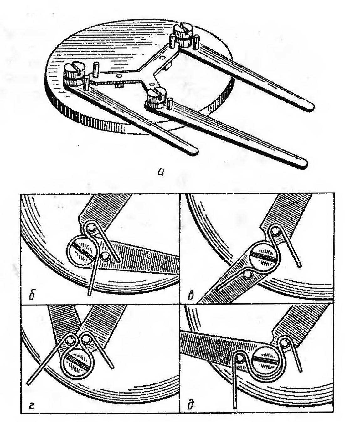 Изготовление пружины начинают с изгиба плеча, который должен быть направлен в сторону, противоположную направлению перемещения зуба (рис. 221, с). Изгиб делают круглогубцами или с помощью прибора Иванова. Прибор состоит из круглой панели с тремя направляющими цилиндрами, которые являются одновременно осями трех рычагов с перемещаемыми штифтами (рис. 222). Последовательность изготовления