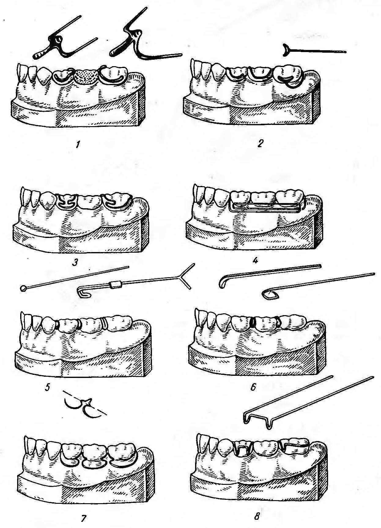 1 — двуплечий; 2 — одноплечий Джексона; Т-образный; 3 — кламмер Дуйзингса; 4 — рамочный; J — пуговчатый и сдвоенный; б — спиралевидный; 7 — стреловидный кламмер Шварца; 8 — кламмеры Адамса.