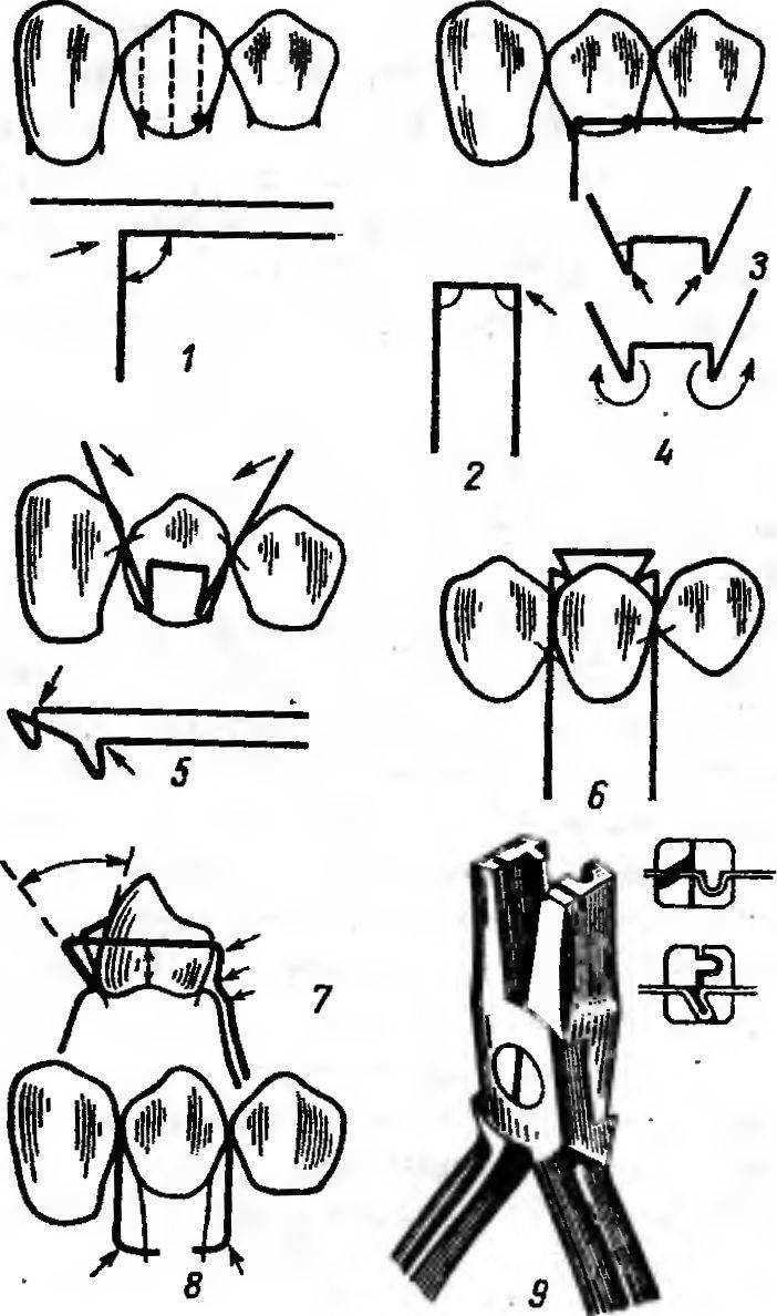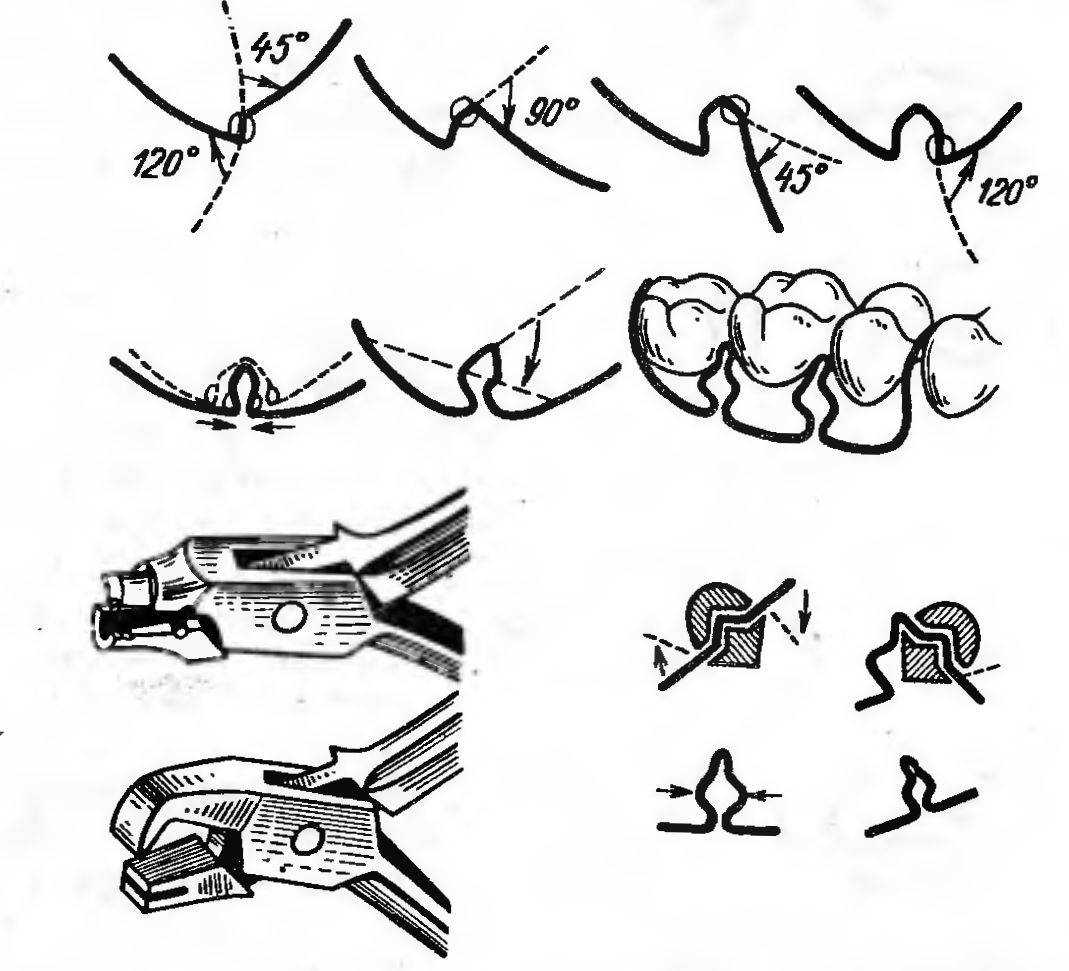 кламмера начинают с изгибания стрелы, которая помещается между двумя премолярами у вершины межзубного десневого сосочка, затем отгибают ее под тупым углом вплотную к пришеечной области двух соседних зубов. Круглогубцами изгибают плечи кламмера так, чтобы они отстояли от слизистой оболочки на 0,5 мм, загибают оба утла стрелы и формируют два полукруглых изгиба в разные стороны, а от них два отростка между соседними зубами к жевательной поверхности и переходят на язычную поверхность, где они входят в базис съемного аппарата. Для изготовления стреловидных кламмеров можно пользоваться двумя парами щипцов (рис. 224). Кламмеры Шварца надежно фиксируют съемные ортодонтические аппараты, но они сложны в изготовлении, их коррекция затруднена. Значительно удобнее в изготовлении и пользовании стреловидные кламмеры с пелотами в модификации И. М. Оксмана и М. 3. Миргазизова.