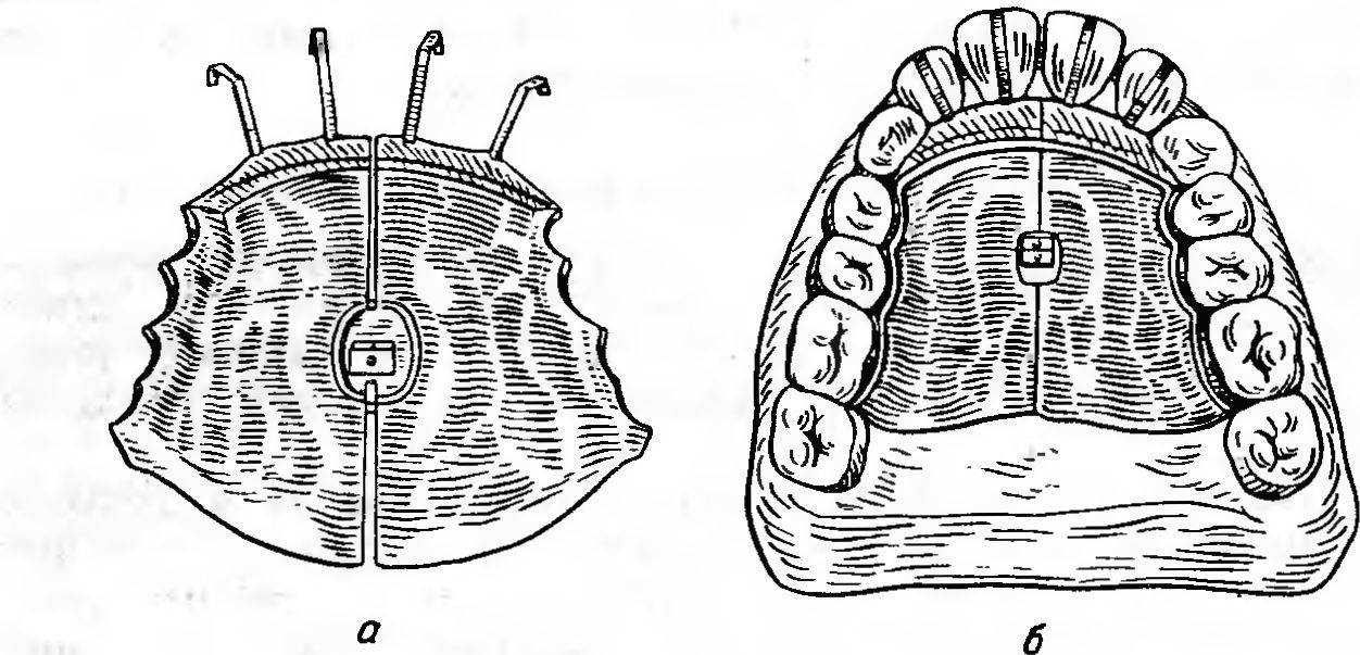 а — пластинка с наклонной плоскостью, перекидными кламмерами и небным винтом; б — аппарат на гипсовой модели.