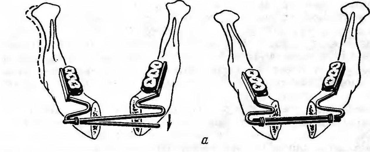 При наличии тугоподвижного смещенного отломка верхней челюсти аппарат изготавливают со встречными внеротовыми рычагами и внутриротовым креплением. Внутриротовая часть состоит из паяной шины в виде коронок или колец с плоскими втулками, припаянными к их щечной поверхности. Во втулки вводят металлические стержни толщиной 3-4 мм из нержавеющей стали, которые выходят у углов рта по наружной поверхности щеки, затем под прямым углом направляются кверху, к височной области, навстречу другим стержням такой же толщины, идущим сверху вниз от головной гипсовой повязки. Концы стержней, идущие от головной повязки, припаивают к полоске тонкой жести, которую пригипсовывают к головной повязке. Перемещая встречные рычаги, регулируют положение отломка верхней челюсти.
