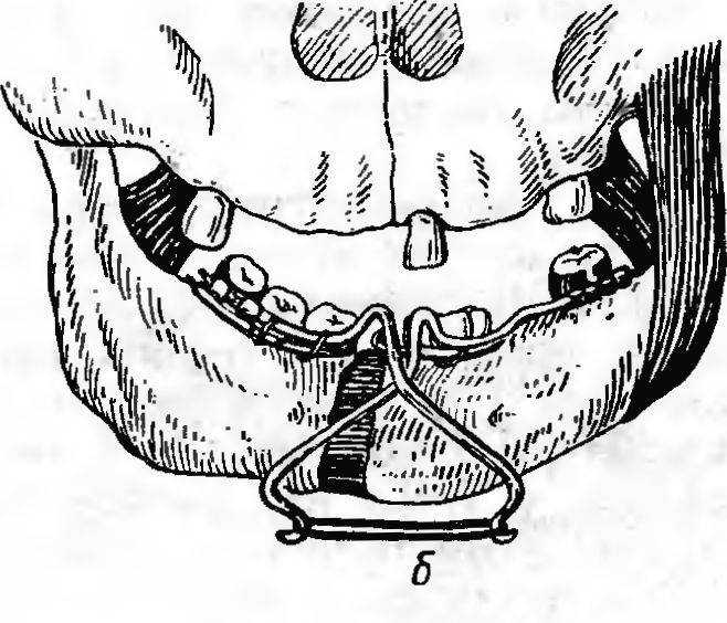 Аппараты Шура. Для лечения переломов нижней челюсти и репозиции отломков используют аппарат, состоящий из капп, которые объединены припаянной к ним дугой, и трубки. Каппы с дугой и трубкой накладывают на зубы верхней челюсти. Имеется также каппа с зацепной петлей, фиксируемая на зубы смещенного отломка нижней челюсти. К щечным поверхностям коронок верхней и нижней шин припаивают трубки овальной формы. Нижняя шина в передней части имеет зацепную петлю. В трубку верхней шины вводят конец проволочного стержня овальной формы, предварительно изогнутого из стальной проволоки толщиной 2—3 мм. Стержень доходит до угла рта, огибая его выходит наружу перпендикулярно зубному ряду и заканчивается зацепной петлей на расстоянии 6—8 см от угла рта. Под действием резиновых колец, накладываемых на зацепные петли шины нижней челюсти и внеротовой части шины верхней челюсти, происходит вправление отломка нижней челюсти. Аппарат Шура по функции комбинированный: вначале репонирующий с помощью резиновой тяги, затем фиксирующий (внеротовой стержень заменяют внутриротовой скобой). При замене фиксирующей скобы на наклонную плоскость аппарат становится направляющим (рис. 260).